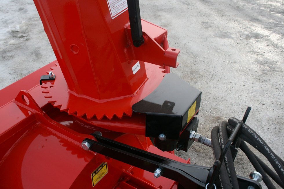 • Hydraulic cylinder and hose support for chute deflector adjustment.