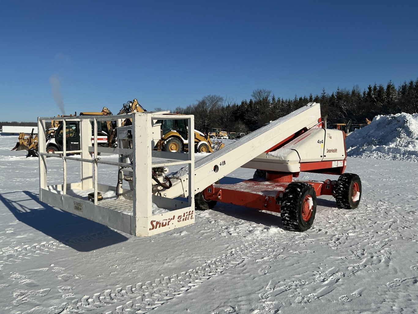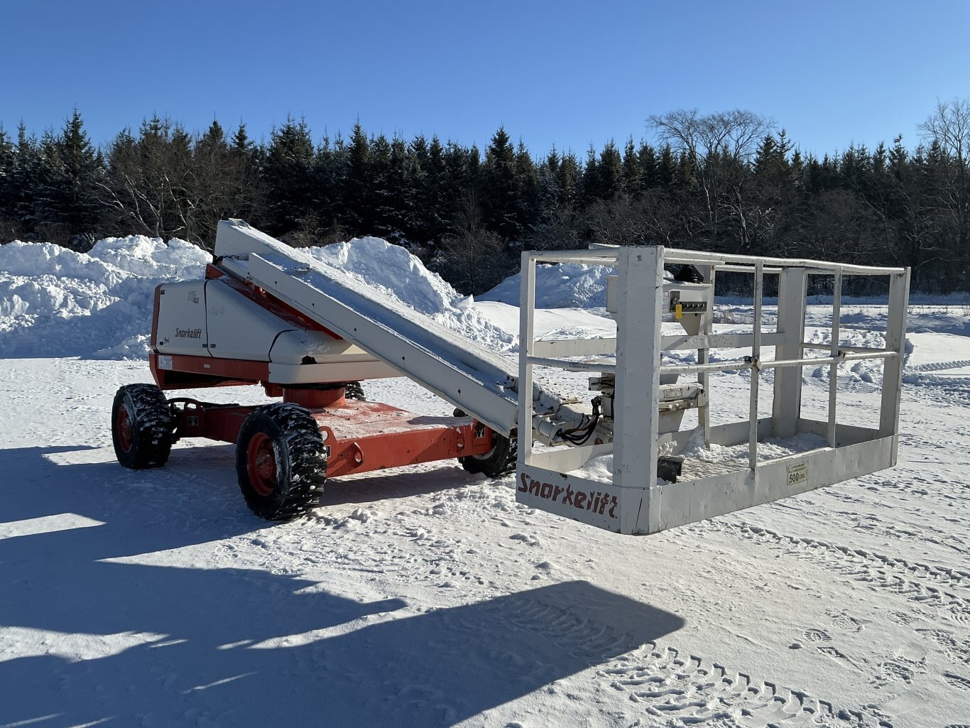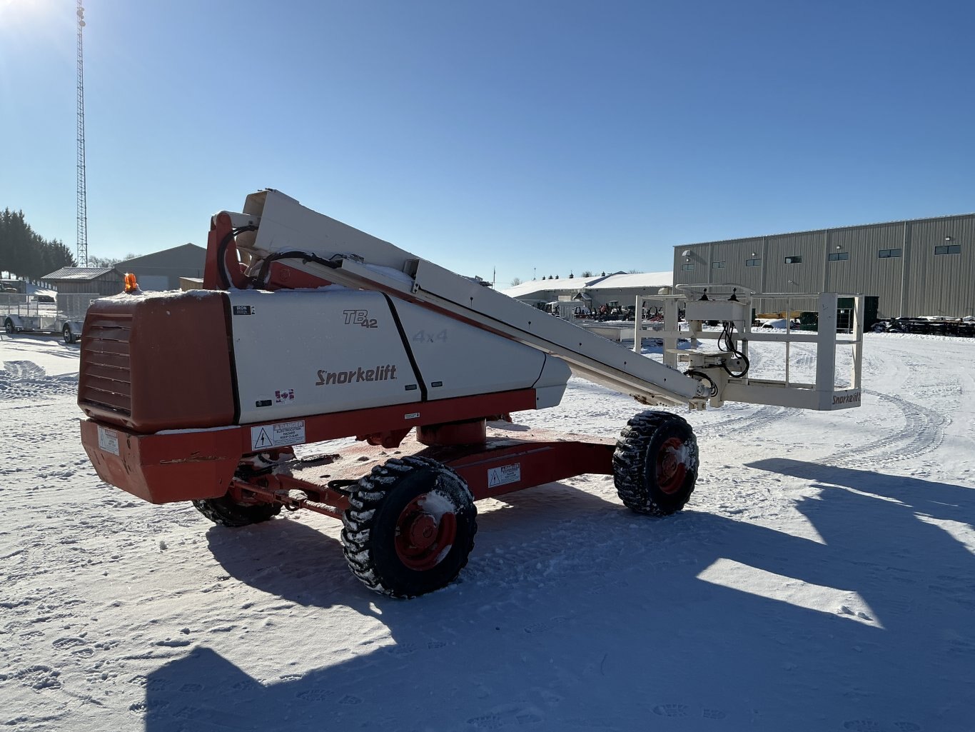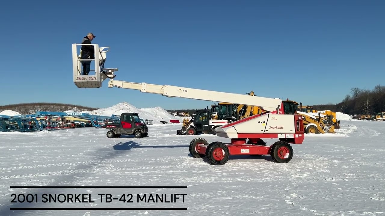 2001 Snorkel TB-42 straight boom. This boom lift has a platform height of 42 feet giving 50 feet working height 4WD driveline and powered by a Cummins diesel engine. Machine weighs around 12,500 lbs. Hour meter shows 4219.