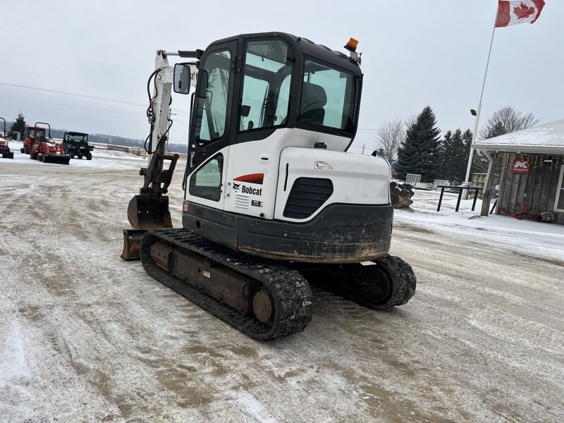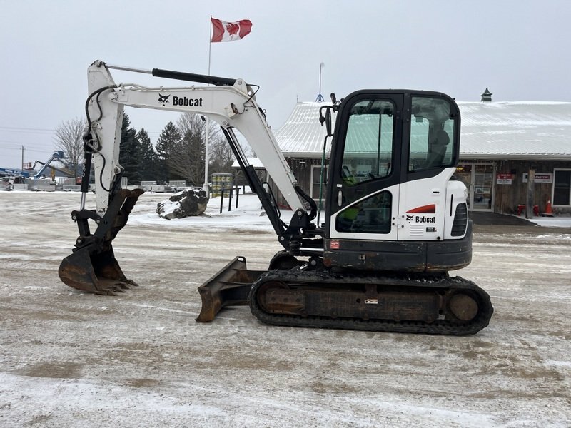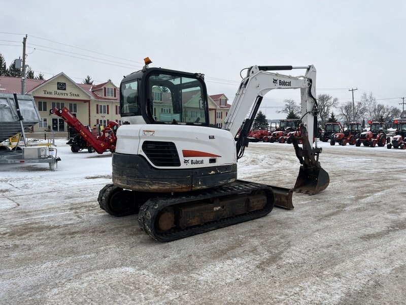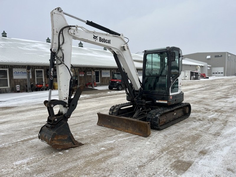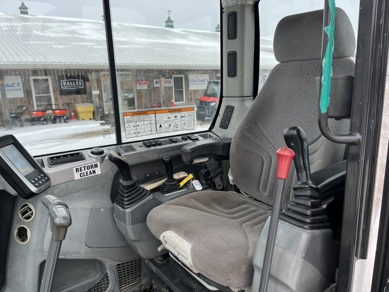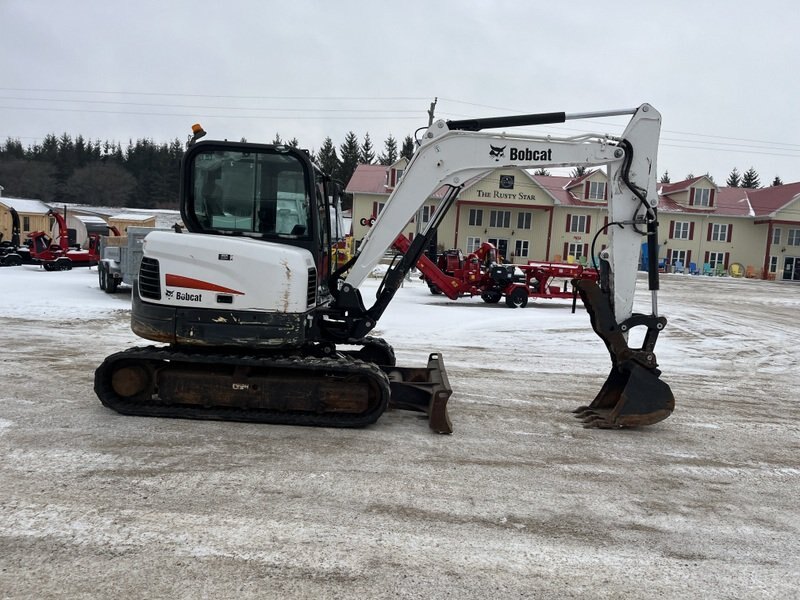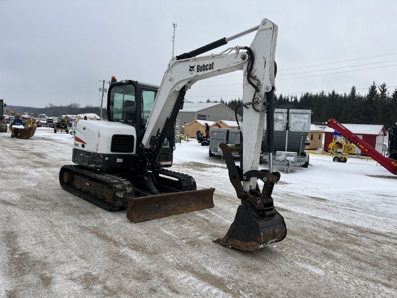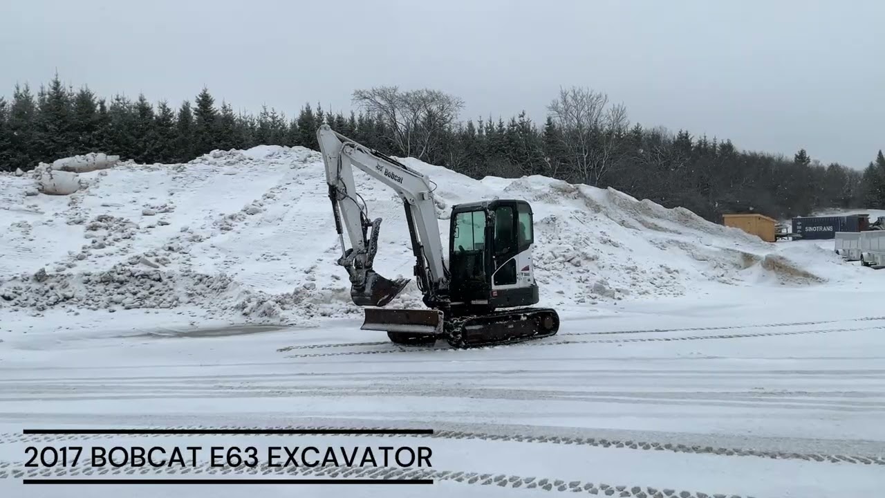 2017 Bobcat E63 is powered by a 59hp diesel engine. Enclosed heated cab and equipped with A/C. Unit is equipped with a manual coupler, hydraulic thumb, and auxiliary hydraulic. Two speed driveline. Unit weights about 13800lbs. Hour meter reads 2612.