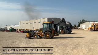 2012 John Deere 310SJ is powered by a 92hp John Deere diesel engine. Unit is equipped with front hydraulic 4 in 1 bucket. Enclosed heated cab with all...