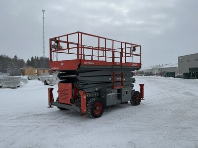 2014 Skyjack SJ9250 elevated platform lift is powered by a GM gas engine. Unit has a valid structural and valid annual. This scissor lift has a...