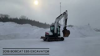 2018 Bobcat E85 excavator is powered by a 59 hp diesel engine. Two speed driveline. Enclosed heated cab with all glass intact Machine has auxiliary...