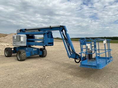 Articulating man lift, 2014 Genie model Z45/25. This boom lift has a platform height of 46 feet giving 51 feet working height and 25 feet outreach....