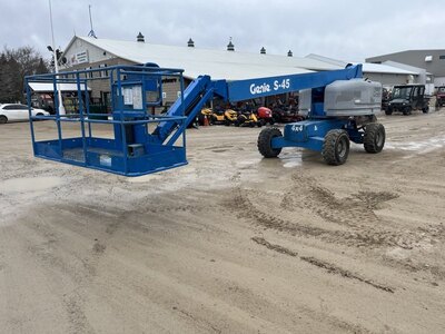 2009 Genie S-45 straight boom with jib. This boom lift has a platform height of 45 feet giving 51 feet working height and 36 feet outreach. 4WD...