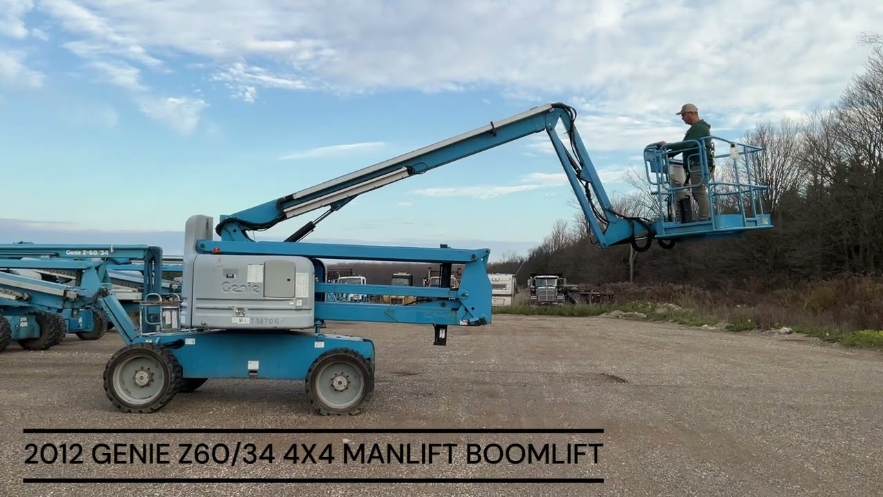 Articulating man lift, 2012 Genie model Z60/34. This boom lift has a platform height of 60 feet giving 66 feet working height and 36 feet outreach. 4WD driveline and powered by a Duetz diesel engine. Foam filled tires. Machine weighs around 24,000 lbs. Hour meter shows 4249. Located in Maxwell Ontario.
